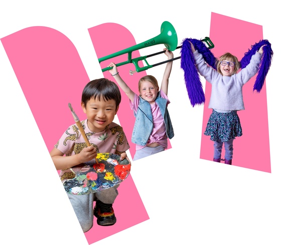 In drie lesblokken van telkens vier lessen maken kinderen vanaf 4 jaar kennis met MUZIEK, THEATER en BEELDENDE KUNST.